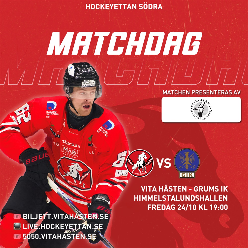 Veckan rundas av på bästa sätt – med hemmamatch i Himmelstalundshallen! Vita Hästen tar emot Grums IK i en het drabbning i Hockeyettan Södra, och vi hoppas på ny seger inför hemmapubliken.