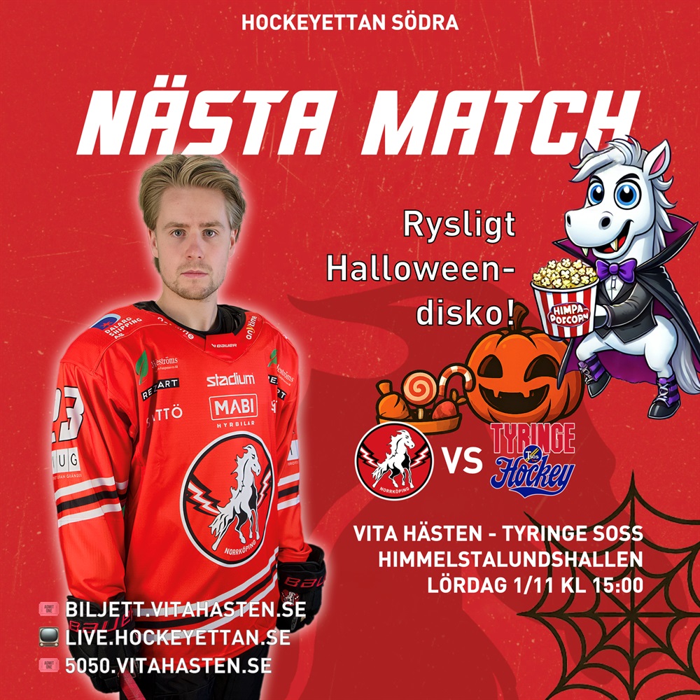 På lördag är det dags för ny hemmamatch i Himmelstalundshallen när Vita Hästen tar emot Tyringe SoSS i Hockeyettan Södra – och det blir inte vilken match som helst. Vi bjuder in till en rysligt rolig eftermiddag för hela familjen med halloweendisko, godisregn och utklädnadstävling!